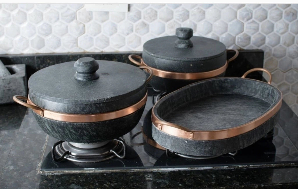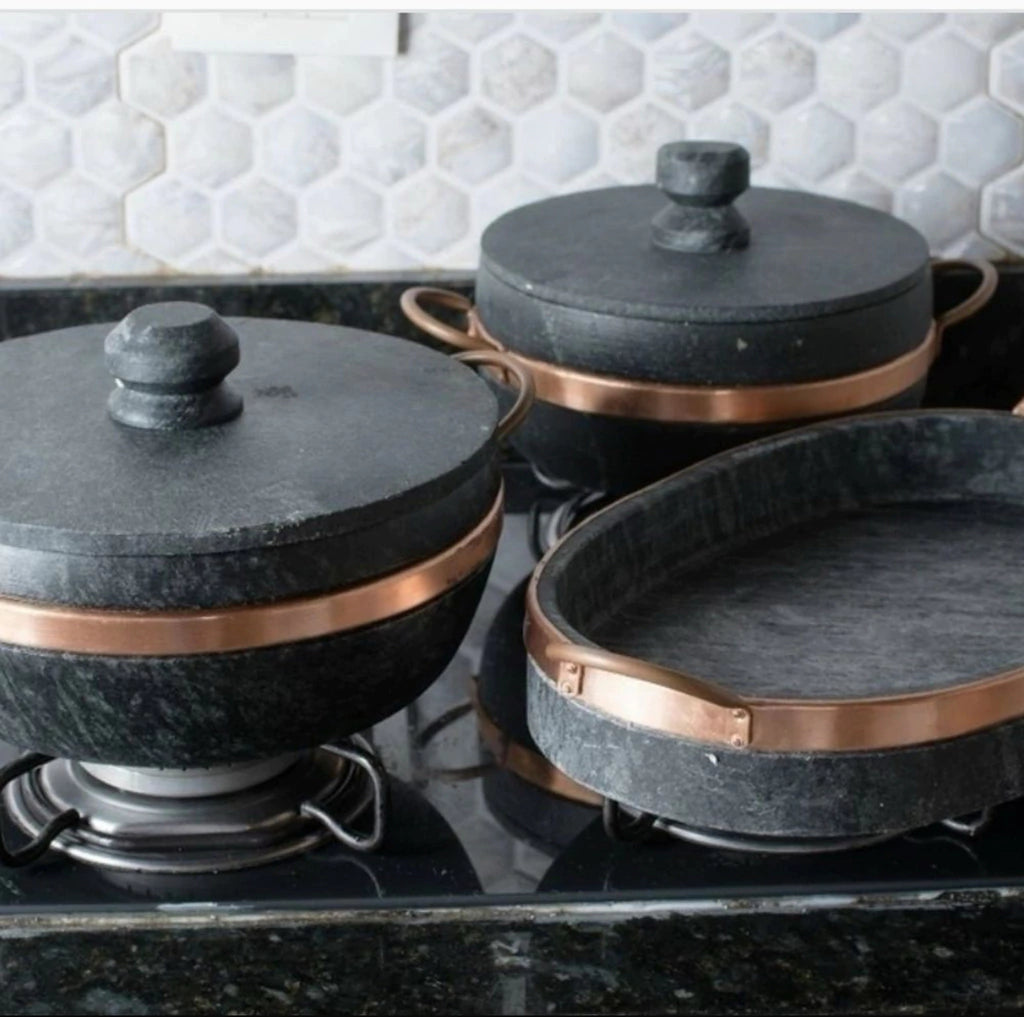 - Material: Pedra sabão e cobre (alças).
