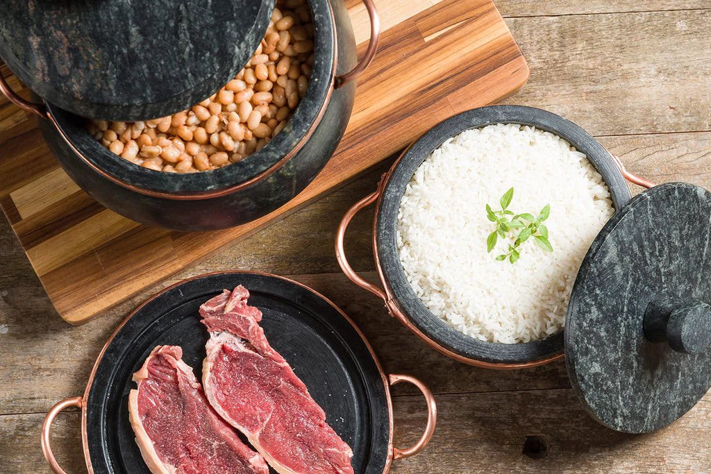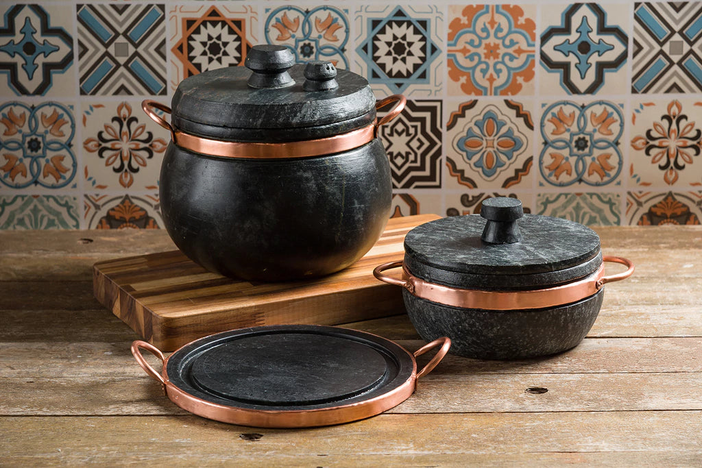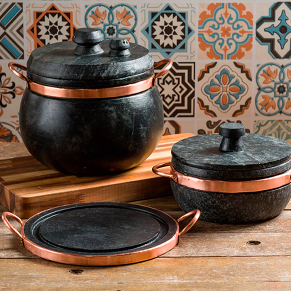 - Material: Pedra sabão e cobre (alças).