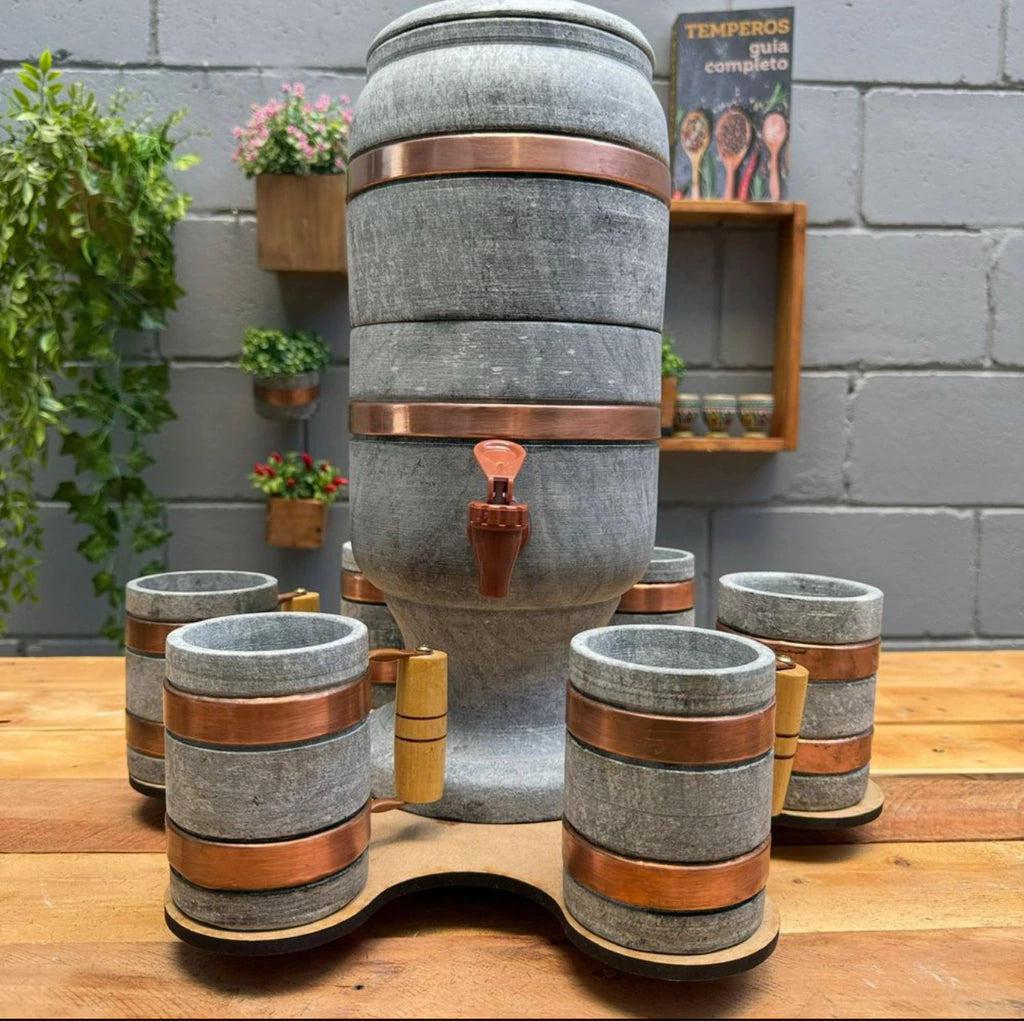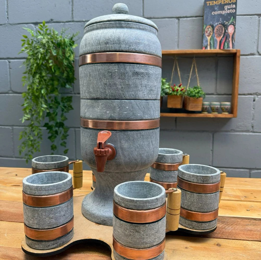 - Material: Pedra sabão, cobre (aro), plástico (torneira) e velas internas**.