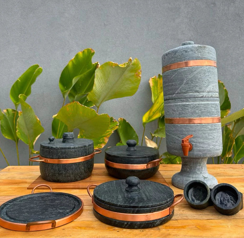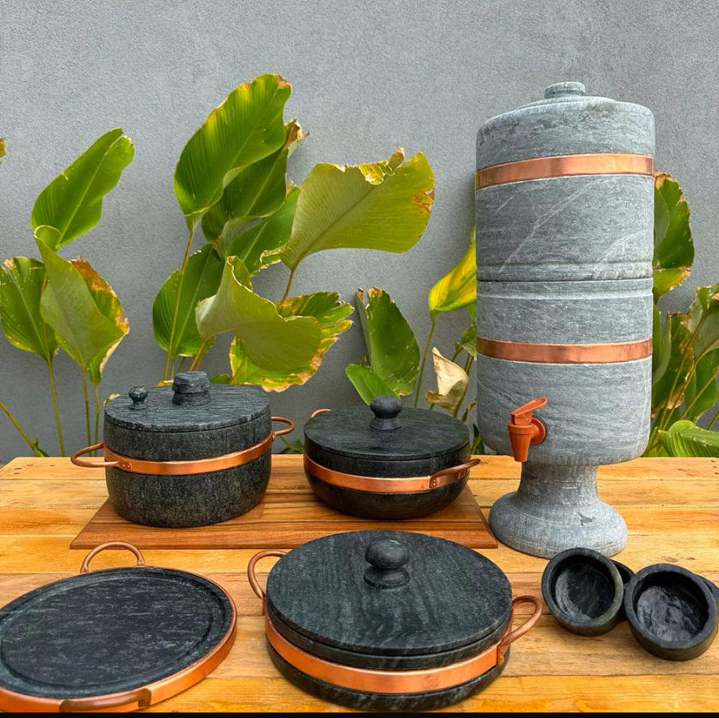 - Material: Pedra sabão, cobre (aro), plástico (torneira) e velas internas**.